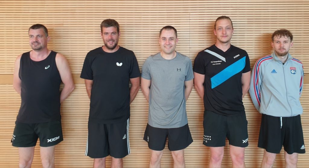 Das Team „Wer schupft verliert langsamer“ des TTC Rangendingen belegt beim Sommerteamcup bis dato mit 4 Siegen unangefochten den 1. Platz. V.l.n.r.: Björn Litzki, Boris Dreher, Ralf Subik, Lukas Schneider und Daniel Storich.