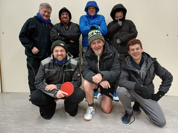 Das Team des TTC Rangendingen II nach den Heimspielbegegnungen gegen den TTC Hechingen und den TSV Talheim in der Besetzung, hinten v.l.n.r. mit Klaus Heck, Alex Klose, Valerii Fokin und Linda Tauchmann, vorne Andreas Berner, Roland Klaffschenkel und Marcel Domnik.